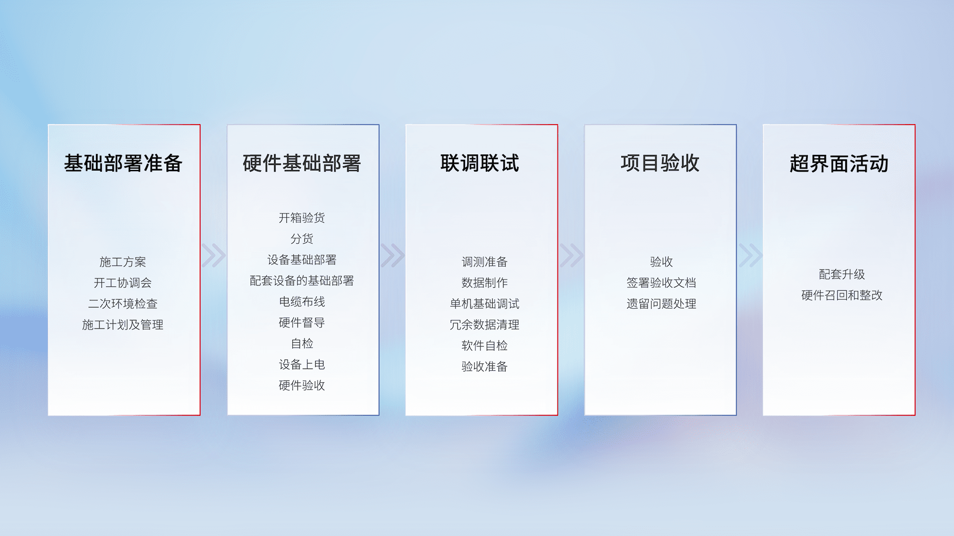从基础部署准备、、、硬件基础部署、、、、联调联试、、、项目验收、、越界面活动的全过程可追溯,,,,保证施工质量和进度。。